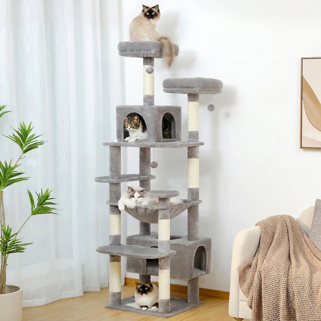 A towering wonderland with cozy perches, private condos, and a plush hammock. Your cat will explore, lounge, and dream in luxurious comfort.